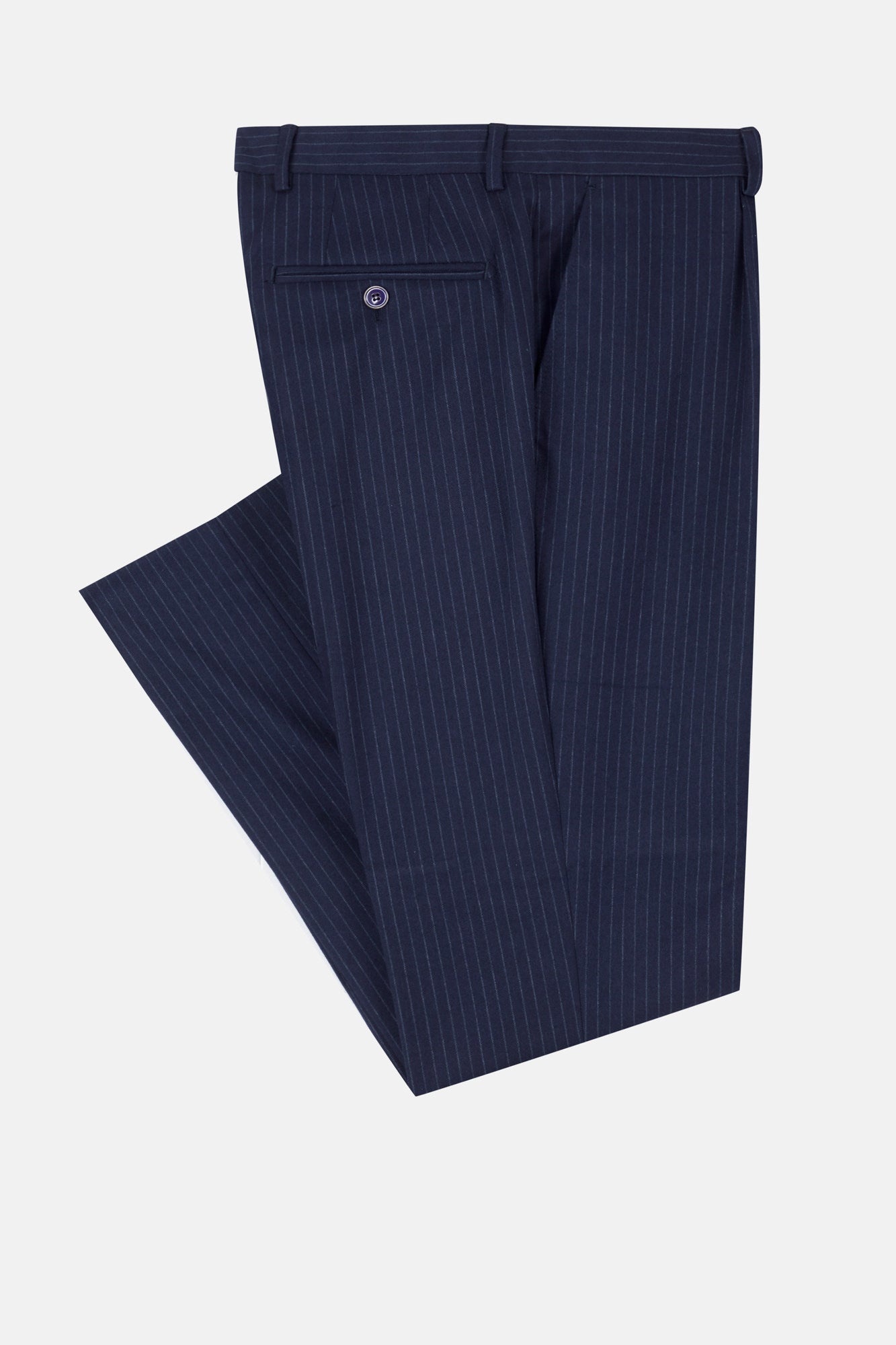 Classic navy pinstripe pattern with contrast detailing