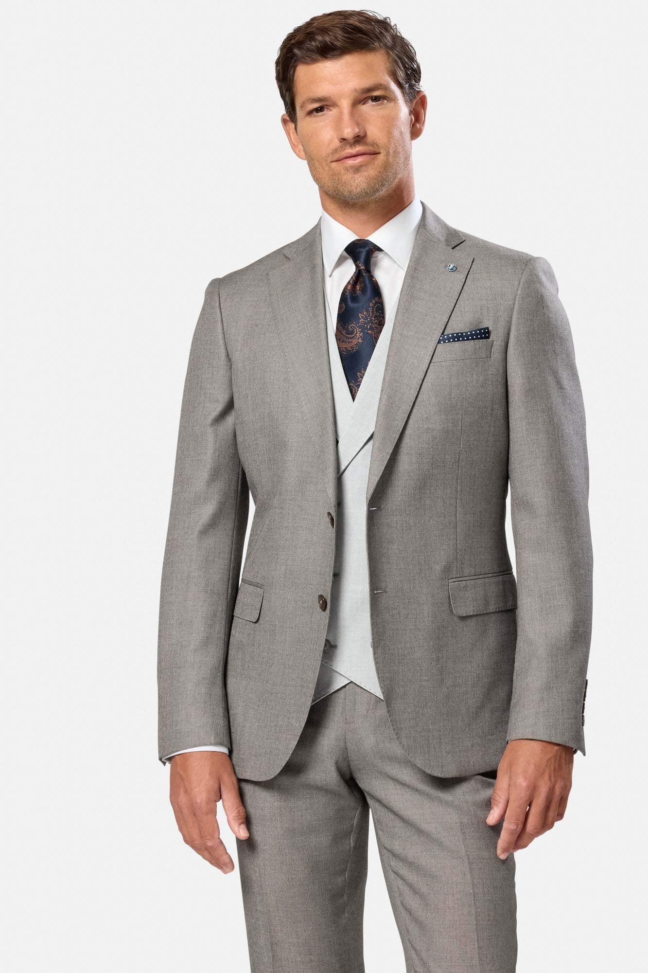 Crafted in Benetti’s signature Lester Fit, the Marco Stone delivers a sharp, structured silhouette with lightweight comfort that carries easily from season to season. Its subtle neutral tone makes it the perfect base for coordination, pairing seamlessly with complementing pieces such as the Albert Silver waistcoat to create a cohesive, elevated look for grooms and groomsmen alike.